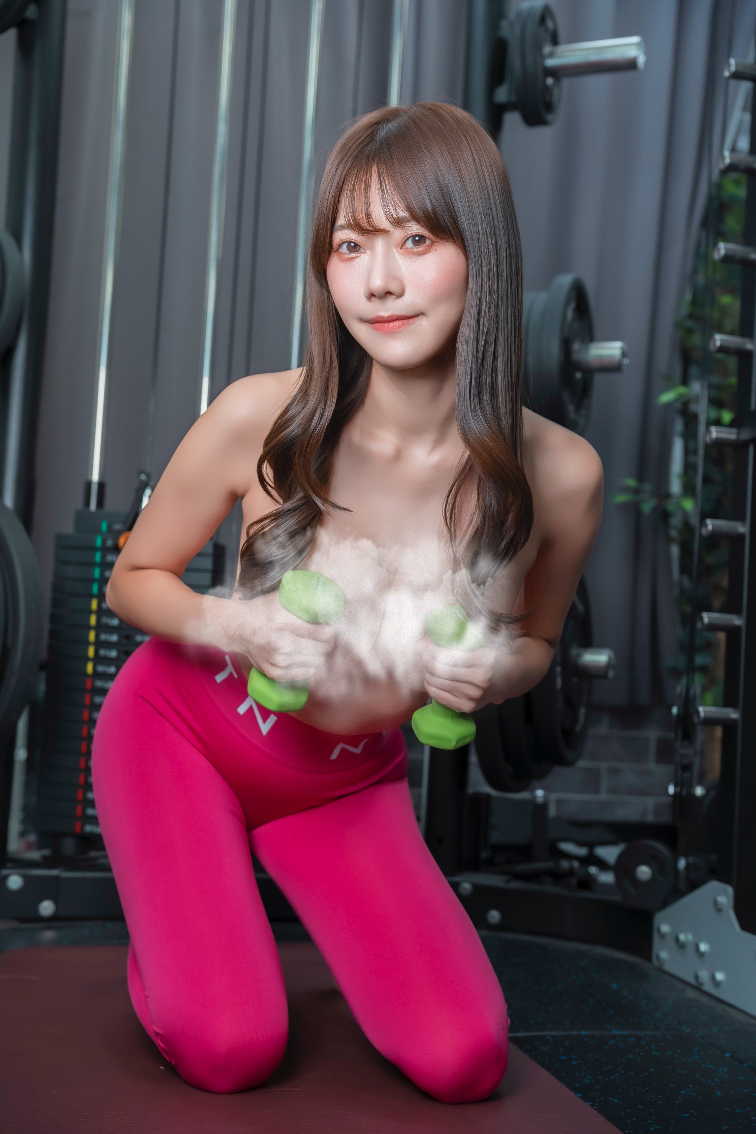 手ブラやダンベルで隠しながらも、挑発するような視線であなたを見つめてくる…